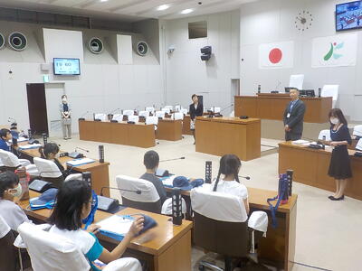 市役所では、議員バッジ(シール)をつけてもらい、模擬議会を体験しました。