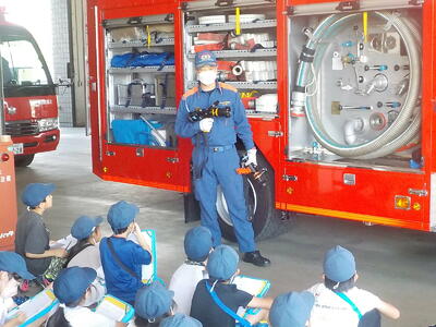 消防署では、館内の様子や消防車の説明を受けました。