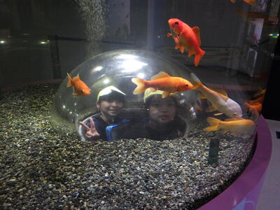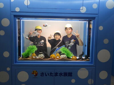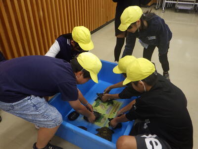 次に、さいたま水族館で、展示されている川魚や両性爬虫類、甲殻類などの生物を見て学んだり、埼玉に生息しているカメについて学び、触れ合うアクアスクールを受けたりしました。