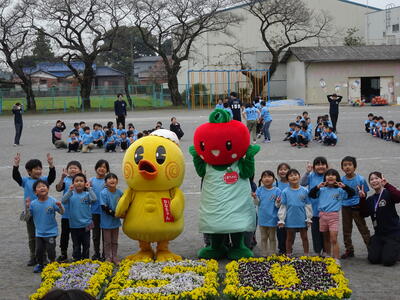 飛び入り参加の鴻巣市のマスコット「ひなちゃん」北本市の「とまちゃん」と共に上空からのドローンに手を振り、みんなで楽しく撮影できました。