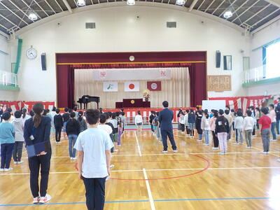 校長の式辞の中で、目当ての確認や150周年記念の横断幕のお披露目をしました。