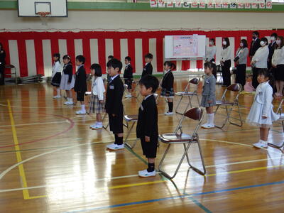 気を付け、休め、前ならえなどの集団行動を行いました。