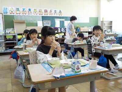 1年生は今日から給食が始まりました。スムーズに配膳が行われ、皆さんおいしそうに食べていました。
